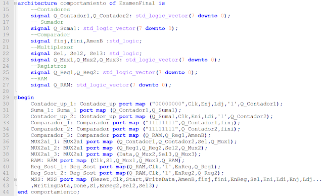 c) Finalmente, realizar el código VHDL del sistema completo con portMap, completando el nombre y funcionamiento del bloque faltante, nombres de señales y tamaño de buses. Asuma que los elementos que están en la partición funcional (incluido el de color amarillo) ya existen en la misma carpeta del proyecto [8p]